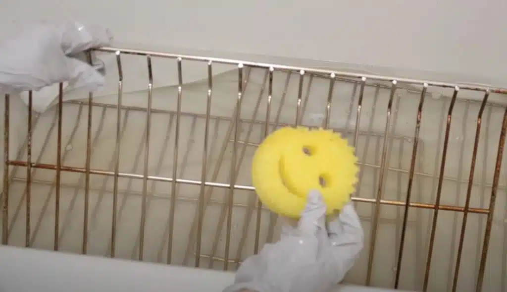 If you’ve got a bathtub or a large enough basin to submerge your oven racks, this might be the easiest and most effective way to clean them because you don’t have to do much! The cleaning solution used to soak the racks will help loosen up grime and even cut through burnt-on grease, making it far easier to scrub down after.